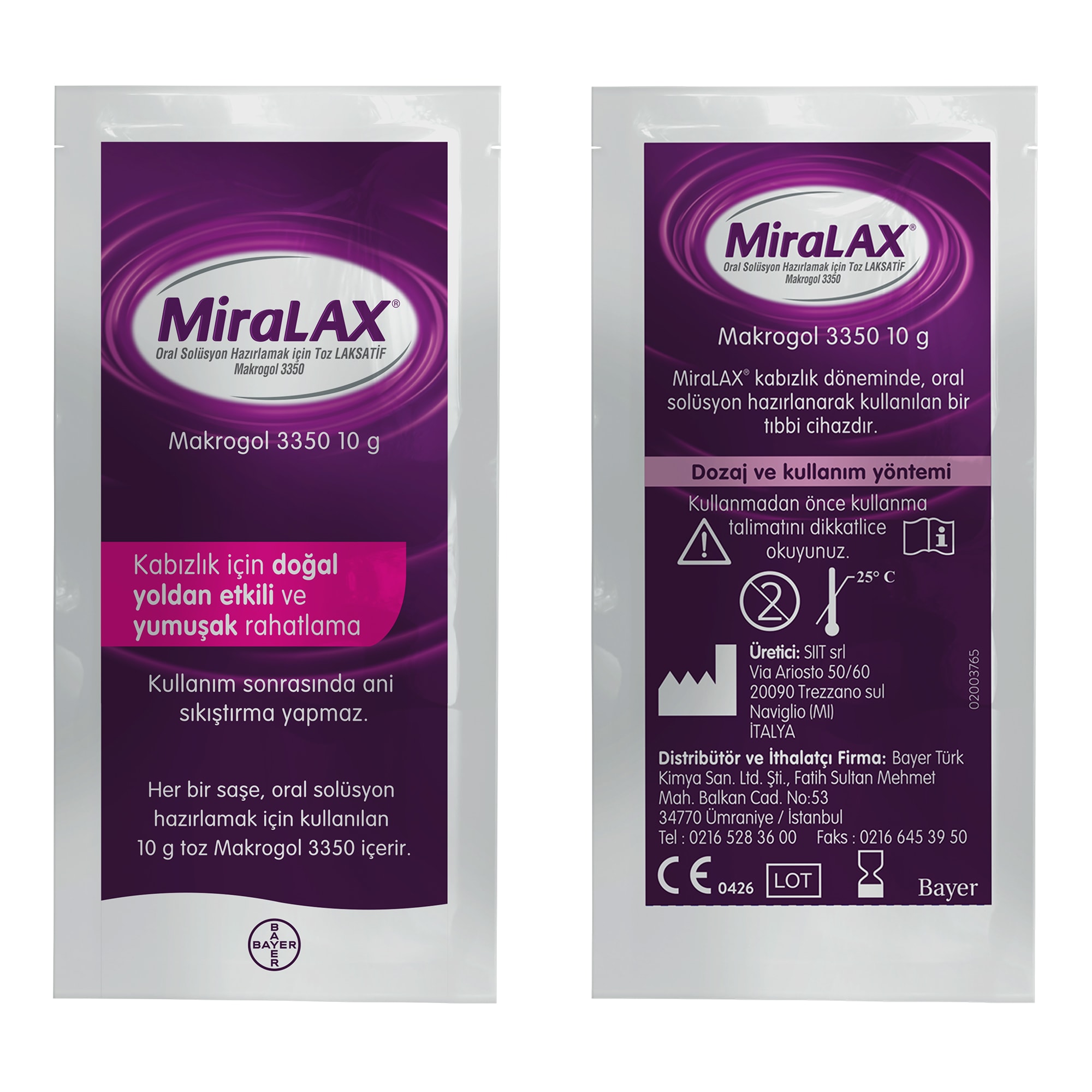 - MiraLAX®, ozmotik etkiyle bağırsak hareketlerini doğal yoldan düzenleyen laksatif bir tıbbi cihazdır. Bağırsakta emilmez veya fermente edilmez, mukozayı irite etmez ve dışkı yoluyla atılır.